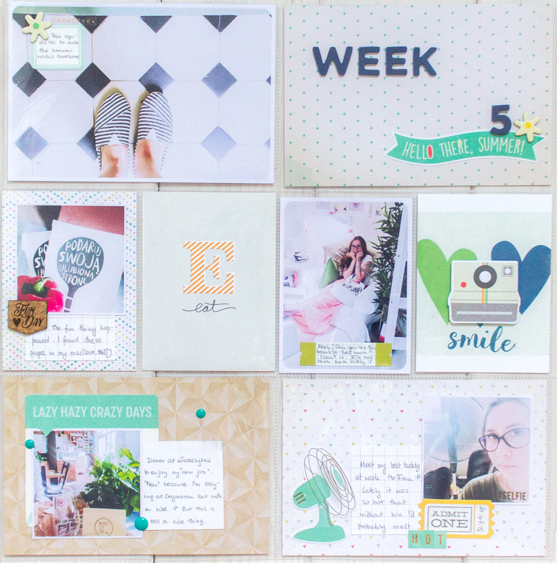 It's 15 - this means our Gossamer Blue blog hop. While jumping from blog to blog you can see tons of beautiful inspiration our great team prepared for you. This time I have a pocket spread to show you. After juicy colours of past week I went back to my more natural state of toned colours. During hot days it's harder tos crapbook so to make the process easier I used my old trick. The big cards are simply papers from the mini pad I found in the Bits and Pieces kit. Thanks to this the layout is cohesive and was super quick to make :)